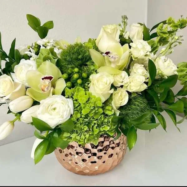Charming mixed arrangement with seasonal flowers in lucky greens, whites, and pops of color