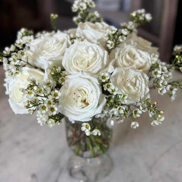 Classic arrangement of premium long-stem white roses with elegant greenery in a signature vase