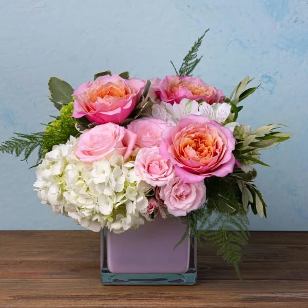 Playful pastel arrangement in soft pinks and lavender with a whimsical garden feel