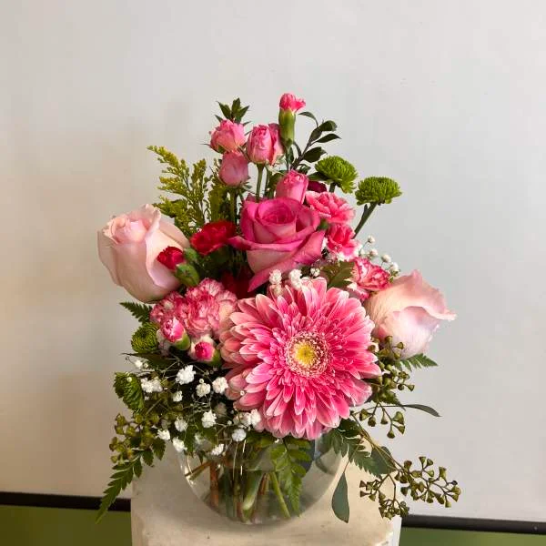 Cheerful all-pink arrangement with roses, carnations, and seasonal pink blooms