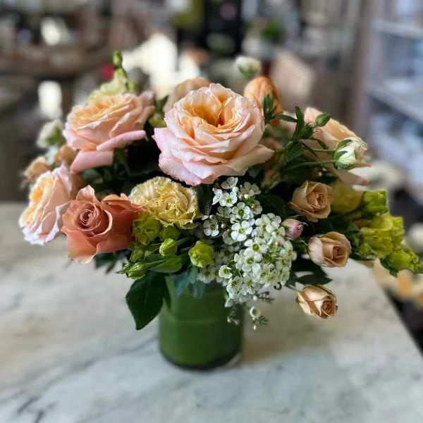 Warm peach and coral arrangement with roses, ranunculus, and seasonal blooms in soft tones
