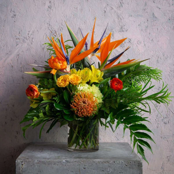 Vibrant tropical arrangement with bold citrus-toned blooms and lush tropical foliage