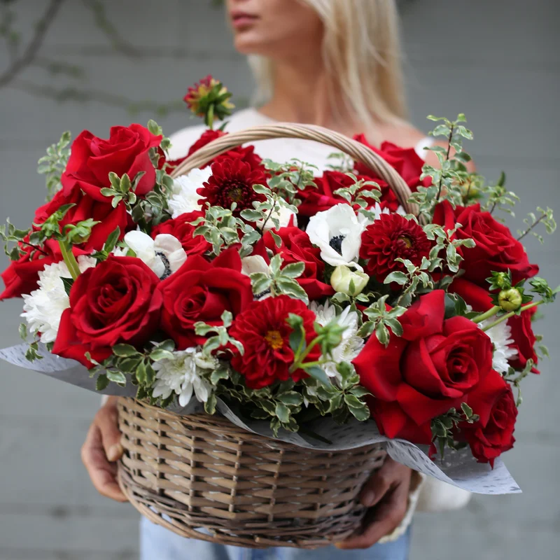 Stunning arrangement of deep red roses in a luxury presentation — bold and romantic