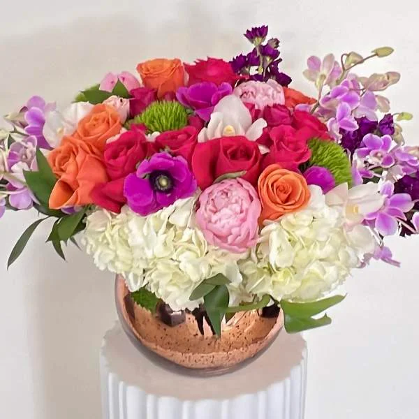 Luxurious summer-inspired design by artist Luz with premium roses, orchids, and tropical accents